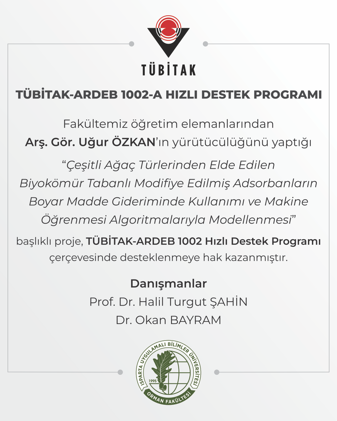 Projemiz TÜBİTAK-ARDEB 1002 Hızlı Destek Programı çerçevesinde desteklenmeye hak kazandı